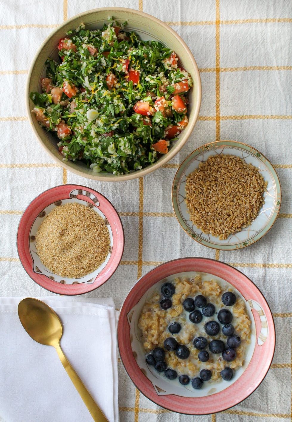Bulgur is a whole grain made from cracked wheat. The reason it’s so quick-cooking is that the cracked wheat is parboiled and dried before packaging, meaning it’s already been lightly cooked. It hails from the Middle East, and can be found in dishes like Lebanese tabbouleh, Syrian kibbeh, and more. Bulgur comes in a variety of textures. They’re rated on a scale from one to four, with one being “fine” and four being “extra coarse.” Number one bulgur cooks up the quickest, but even number four bulgur will be ready to eat in a fraction of the time of other whole grains like spelt or brown rice.