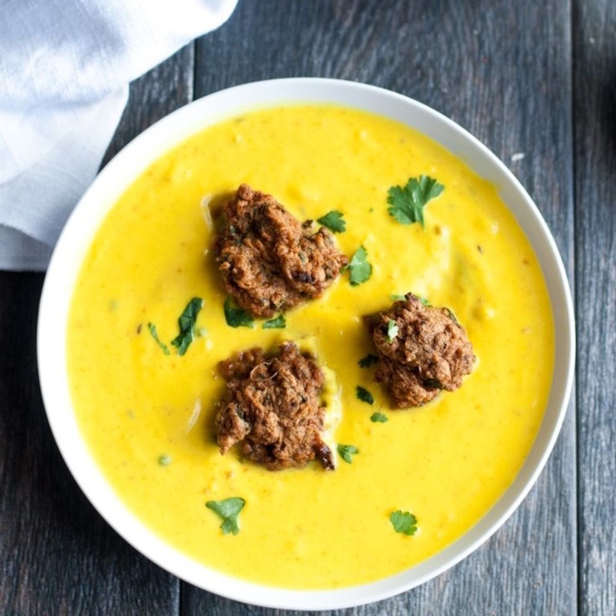 Hearty and flavorful, Punjabi Kadhi is the *perfect* meal for a cool winter or spring evening. Those little balls in the center are spiced, flour-coated Indian potatoes (AKA pakoras), and they make for a delicious contrast with the creamy curry broth. (via WhitBit’s Kitchen)
