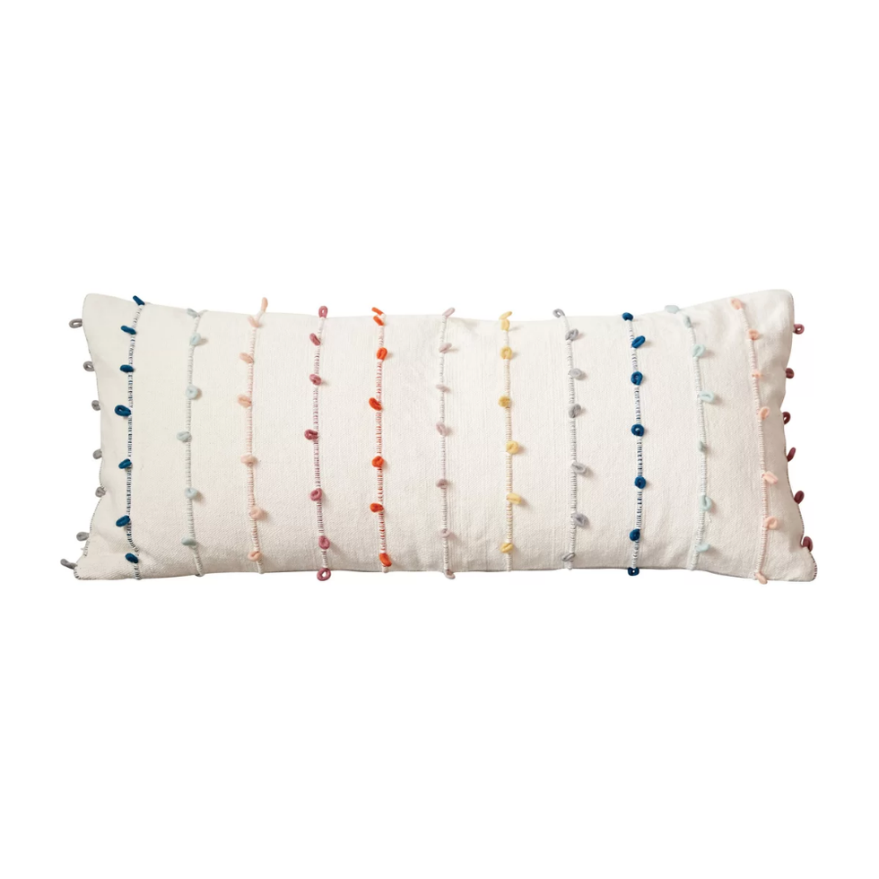 Skip the cheesy seasonal prints this summer and opt for this neutral cotton pillow with colorful pom accents instead.