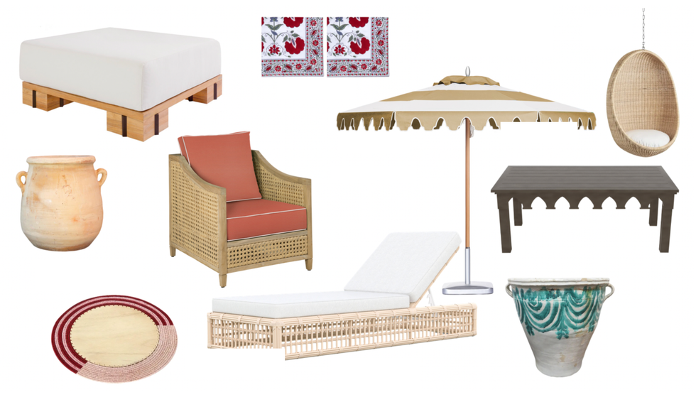 Mediterranean style meets California in this relaxed trend. "Imagine overgrown bougainvillea, vine-covered stucco, and long, late-night dinners on the patio," Brockway said. Even if you're looking to update more than just your outdoor space, the wicker, terra cotta color scheme, and bold prints will look good in every room.