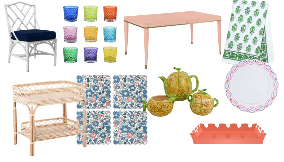 Even if you're not traveling somewhere tropical this summer, you can still bring island life to your home with bright punches of color, tropical prints, and wicker. Pick one or two statement pieces as starting points and tie in the rest of your decor. "Expect pineapple motifs everywhere from serving plates to table lamps, alongside Chinese Chippendale chairs and tons of fabulous rattan and wicker," Brockway said.