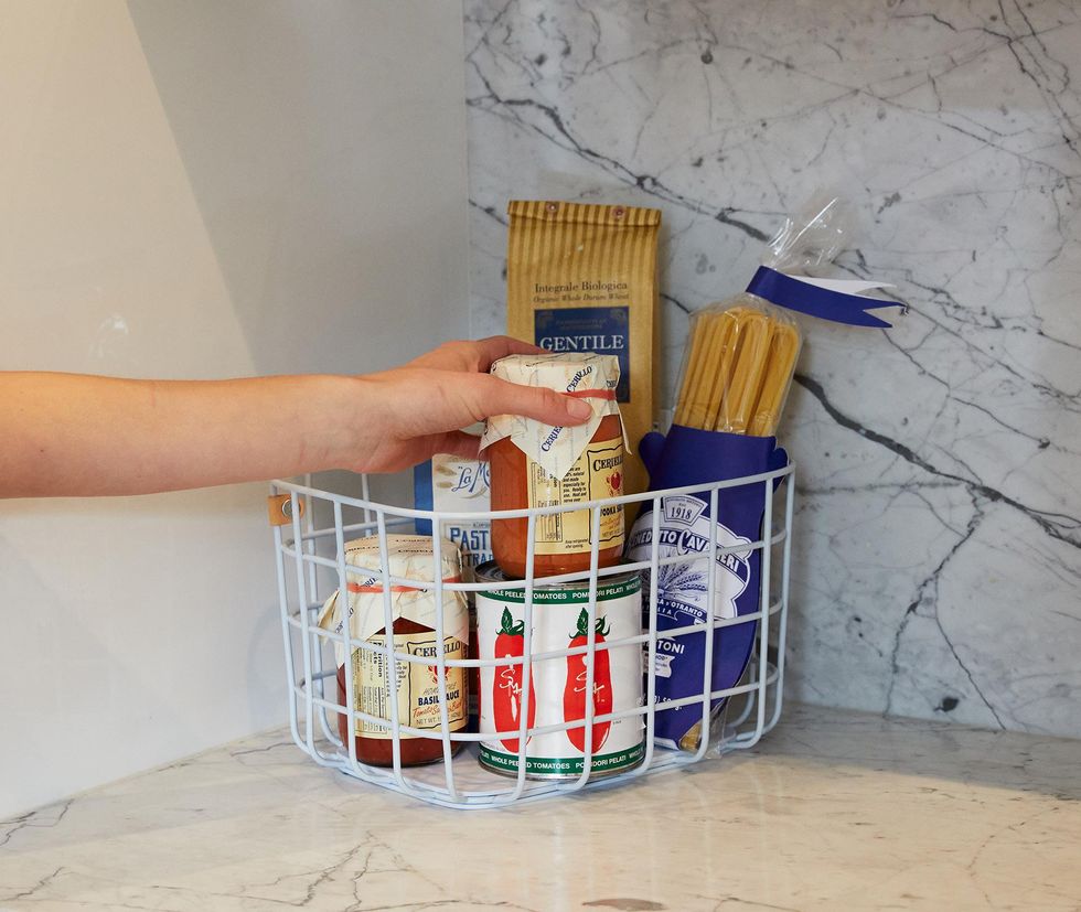 Shelves: Keep smaller items or condiments in baskets so you won't have to guess what's inside, like this basket from Open Spaces. Try round turntables to make bottles easily accessible, and colorful containers that'll keep things looking clean and organized. If your shelves are at different heights, you can keep short and fat items on the top shelf and larger ones near the bottom.