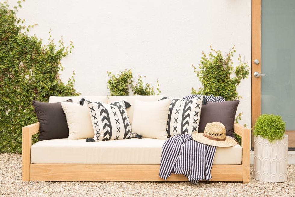 When it came to her wishlist, comfortable places to sit were at the top. “I think having an appropriate amount of seating is really critical to create an outdoor space that actually gets used frequently,” she says. Other things like plush linens and a reliable source of heat (i.e., a handy heat lamp) also made the cut.