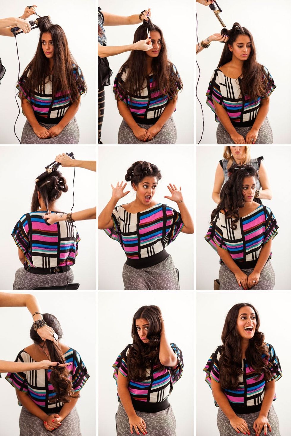 On the left, boring lifeless hair. On the right, a Pantene commercial! To create this look, we created 8 big curls and set them by pinning on top. Just follow the steps below!