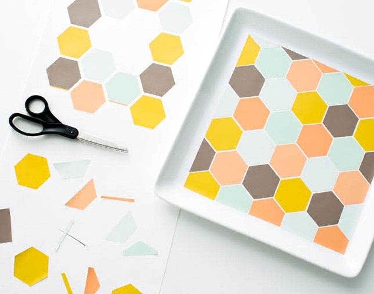 We took this Tiny Honeycomb Wall Decal Set ($29.50) and used the decals to turn a plain old white tray into a beautiful, conversation-worthy piece of decor.