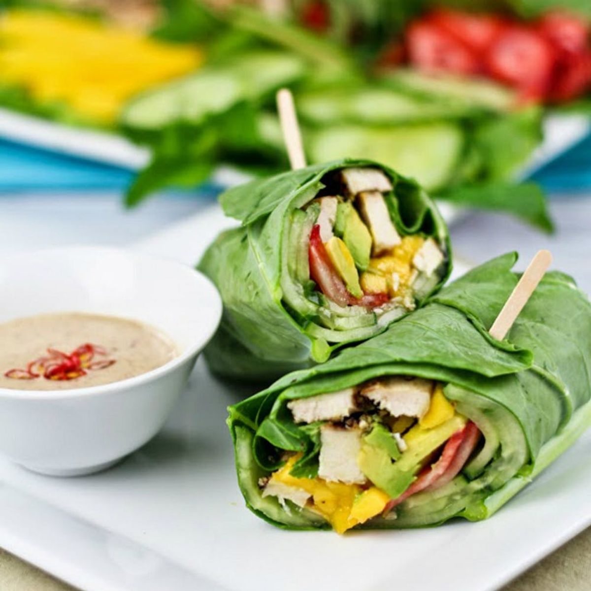 8. Collard Wraps With Satay-Style Dipping Sauce: Between the selection of fruit used and the coco-nutty satay-style sauce, these wraps serve up a generous helping of tropical flavors. Talk about a great way to brighten up your afternoon. (via The Healthy Foodie)