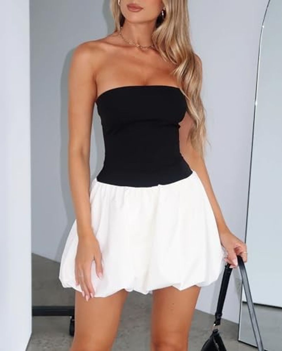 If your summer vacation is going to consist of partying the night away with strangers at the club, this is the perfect dress. This mini dress is great for dinner, dancing, and overall merriment. With a bubble skirt and a strapless top, this black and white dress will be a favorite on your vacation.