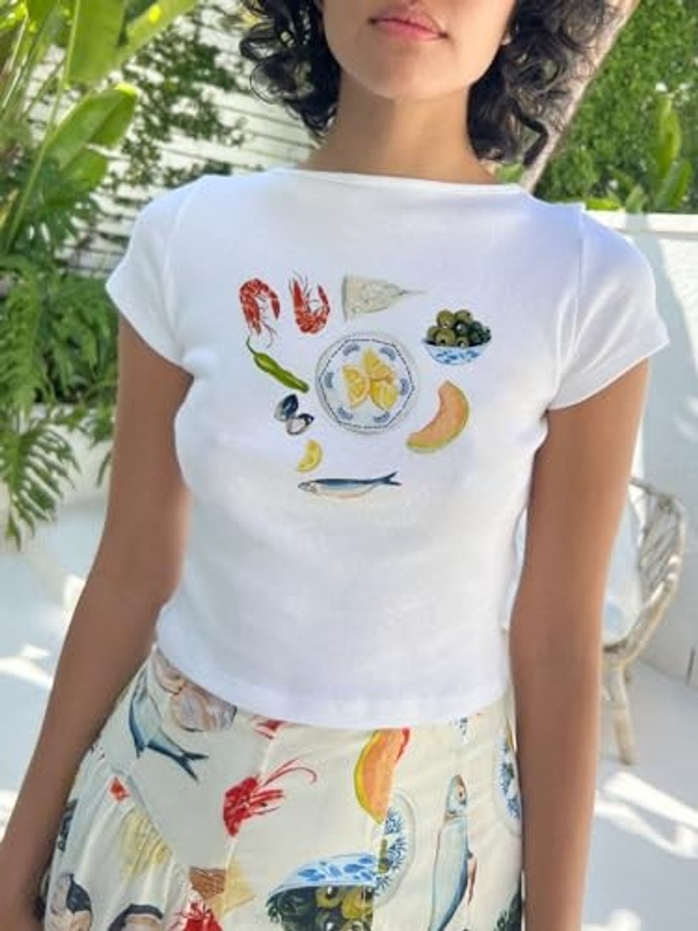 Quirky, tiny T-shirts are all the rage this season. If you are looking for a shirt that just screams, "I am on vacation," you'll want to check out this graphic baby tee. With a fun food design, this unique top pairs with jeans, shorts, or your favorite neutral skirt.