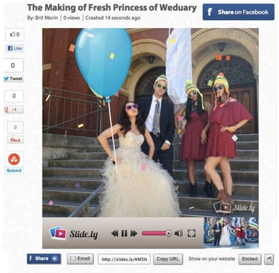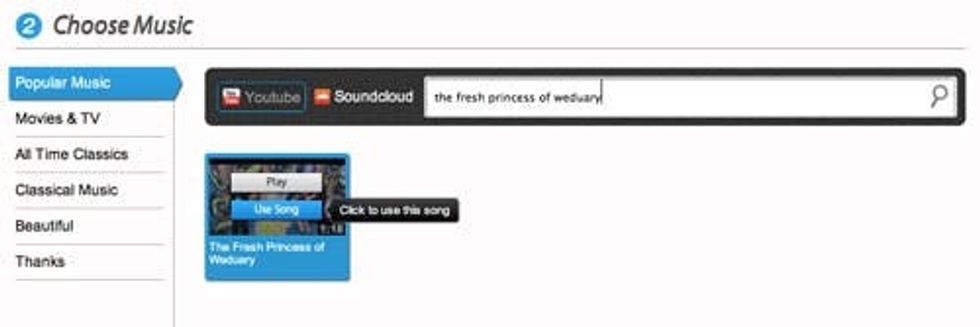 Here's where you choose your tunes. For some events, you probably won't need tunes but there's no harm in adding them, especially if you want to share the slideshow after the party, wedding, or any other epic event. For our little test, we went with Brit's Fresh Prince parody, the Fresh Princess of Weduary. Obvs.