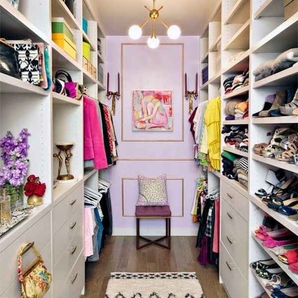 1. Take a Seat: If you have the room, add a seat like a little bench or a DIY ottoman. Even if you only use it for the basic necessity, just having seating in your closet implies that you have enough leisure time to lounge about in there while picking out the perfect outfit. (via Design Love Fest)