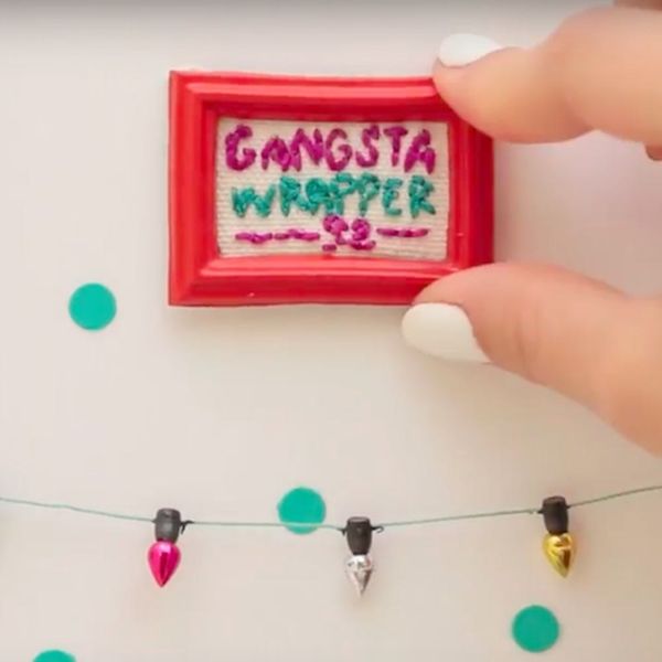 First, sketch your desired phrase with a pencil — we chose “Gangsta Wrapper” because… holidays, of course! Next, you thread the needle and carefully follow the letters.