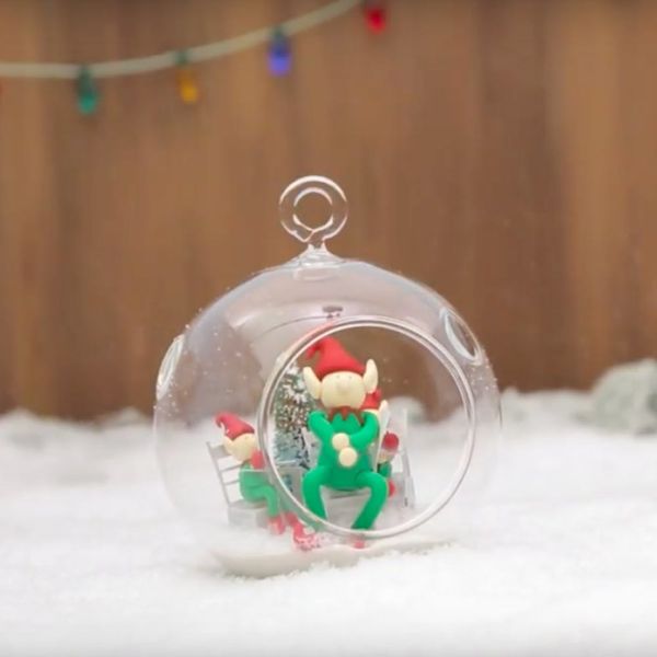 Last week in our Make It Mini video series, we showed you how to craft the merriest of mistletoe headbands. This week, Make It Mini puts our little friend the Elf on a Shelf into a terrarium ornament! All you need for this swift and nimble mini DIY is a glass ornament with a sizable opening, sand, fake snow, mini fake trees, elves and anything else mini you’d like to add — we chose little desks and chairs. Once you have all your elven accessories, you can get to making the cutest terrarium we ever did see!
