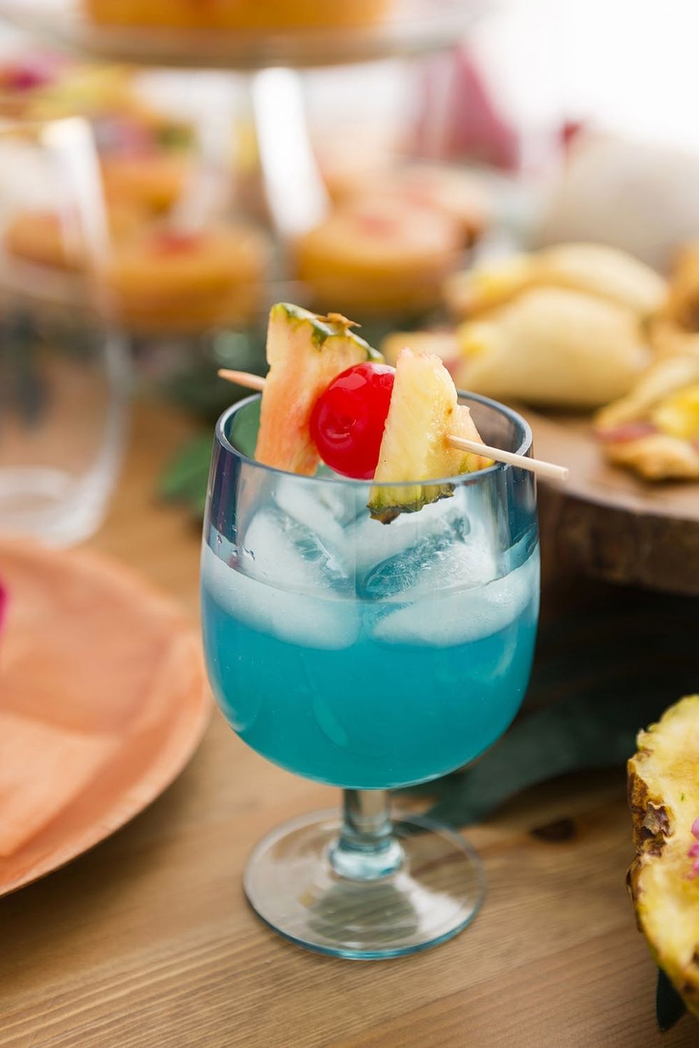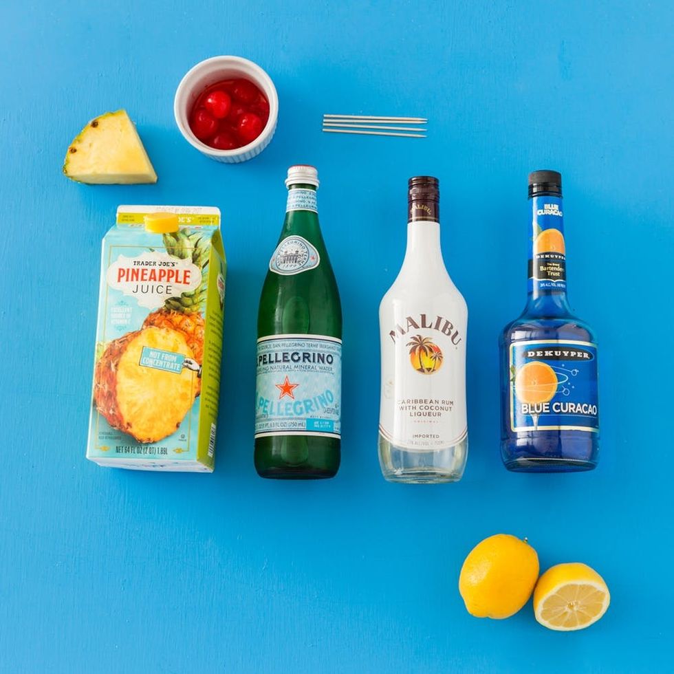First things first: Squeeze out some fresh lemon juice. In a cocktail shaker, add in Malibu, blue curaçao, pineapple juice, and some freshly squeezed lemon juice. Shake things up and pour out the blue concoction into a cocktail glass. Top off the glass with some sparkling water. Garnish with a delightful fruit skewer, fit for the daughter of the village chief.