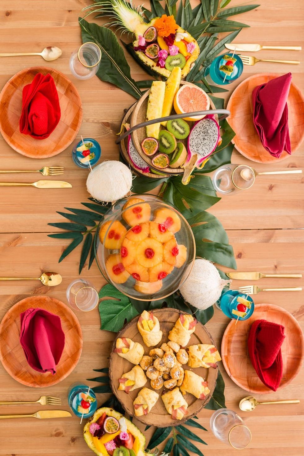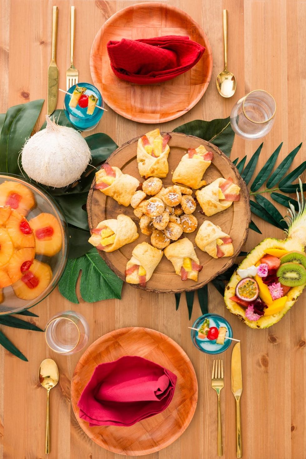 To set the stage, arrange a table runner with palm fronds. Moana’s village, Motunui, loves coconuts, so be sure to add a couple to the table, either for decor or to crack open and munch on later.
