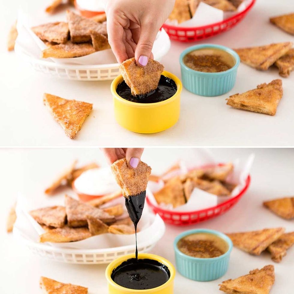 Serve up your churro chips with fudge sauce, caramel sauce, and some fresh whipped cream.