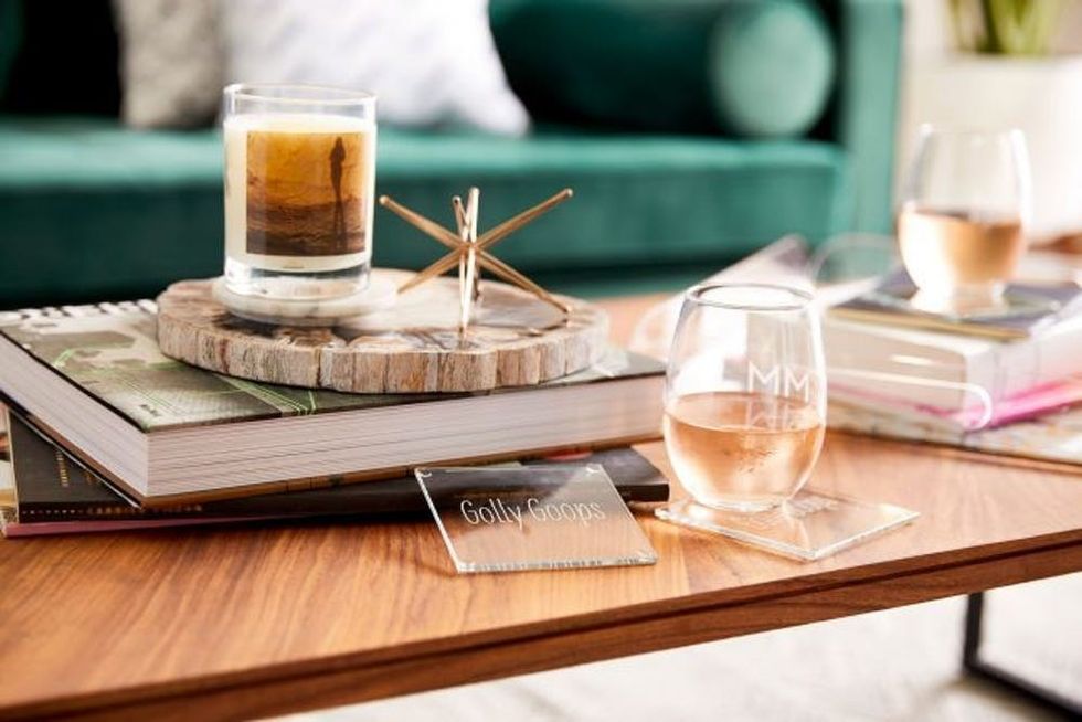 One of Moore’s design tips is to add personal touches to your coffee tables and shelves. Shutterfly’s Make Your Own Statement Wine Glass ($20) and the Make Your Own Statement Glass Coaster ($25, set of four) became the perfect chance for Moore to monogram wine glasses and pop cheeky quotes on a set of glass coasters.