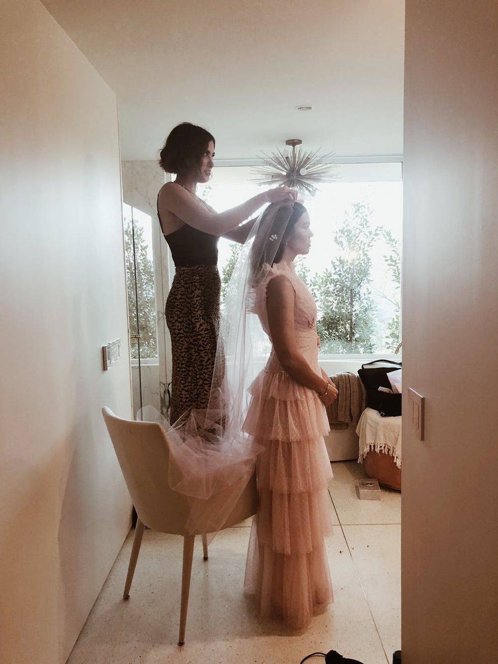 “Mandy’s pink dream wedding hair was inspired by her custom layered Rodarte dress,” Garnier brand hairstylist (and Moore’s BFF) Ashley Streicher said. “The perfect pale pink hue of the dress adorned with babies breath florals inspired a whimsical and romantic feel, while still remaining classic.” Streicher created subtle waves and meticulously placed flowers throughout.