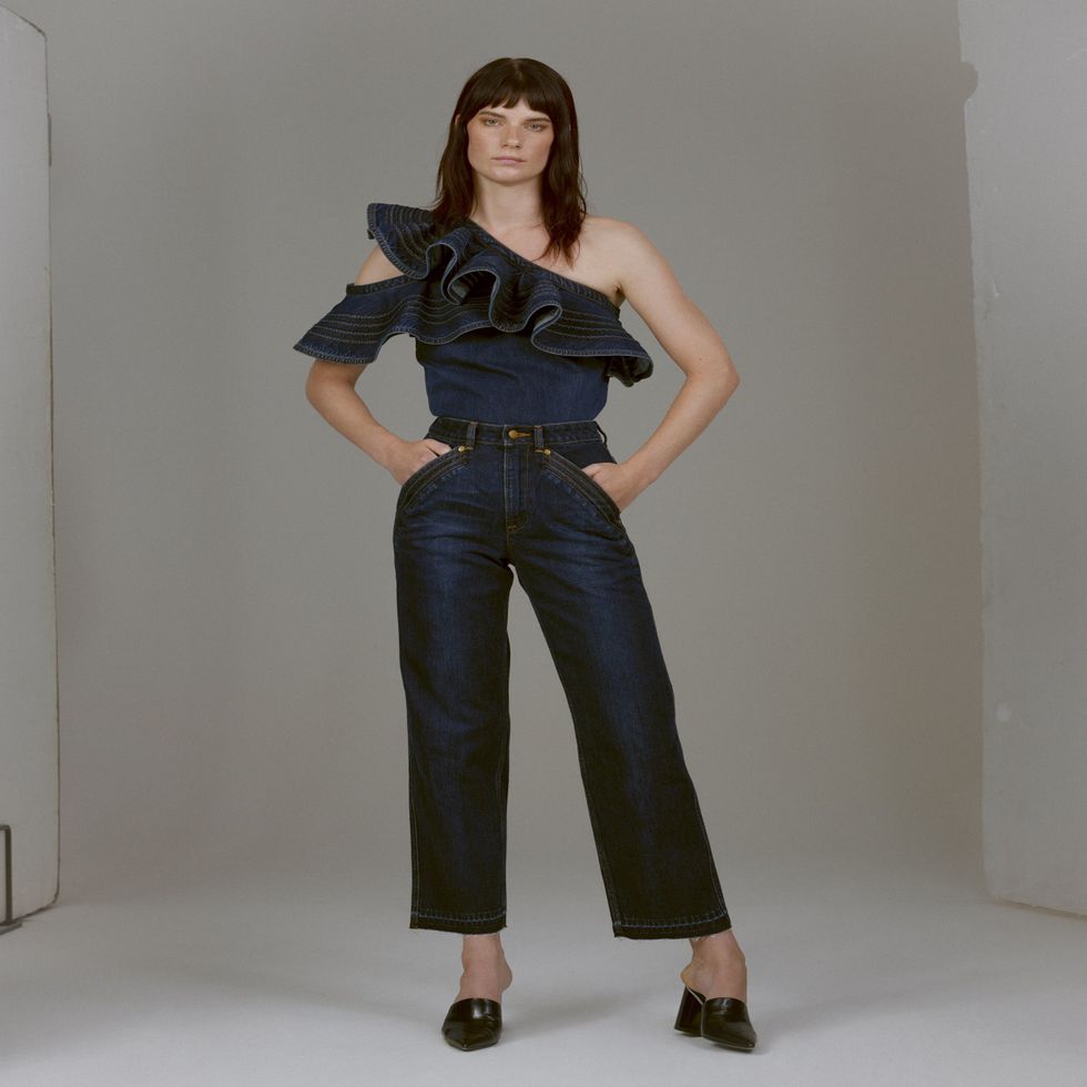 self-portrait x Lee ($200+): You can expect plenty of sculptural cuts and ruffles from this exciting collab that gives fabulous new meaning to the Canadian tux. Choose from a body contouring dress, a bustier, a jacket, flared culottes, and plenty of other pieces in black and dark blue washes.