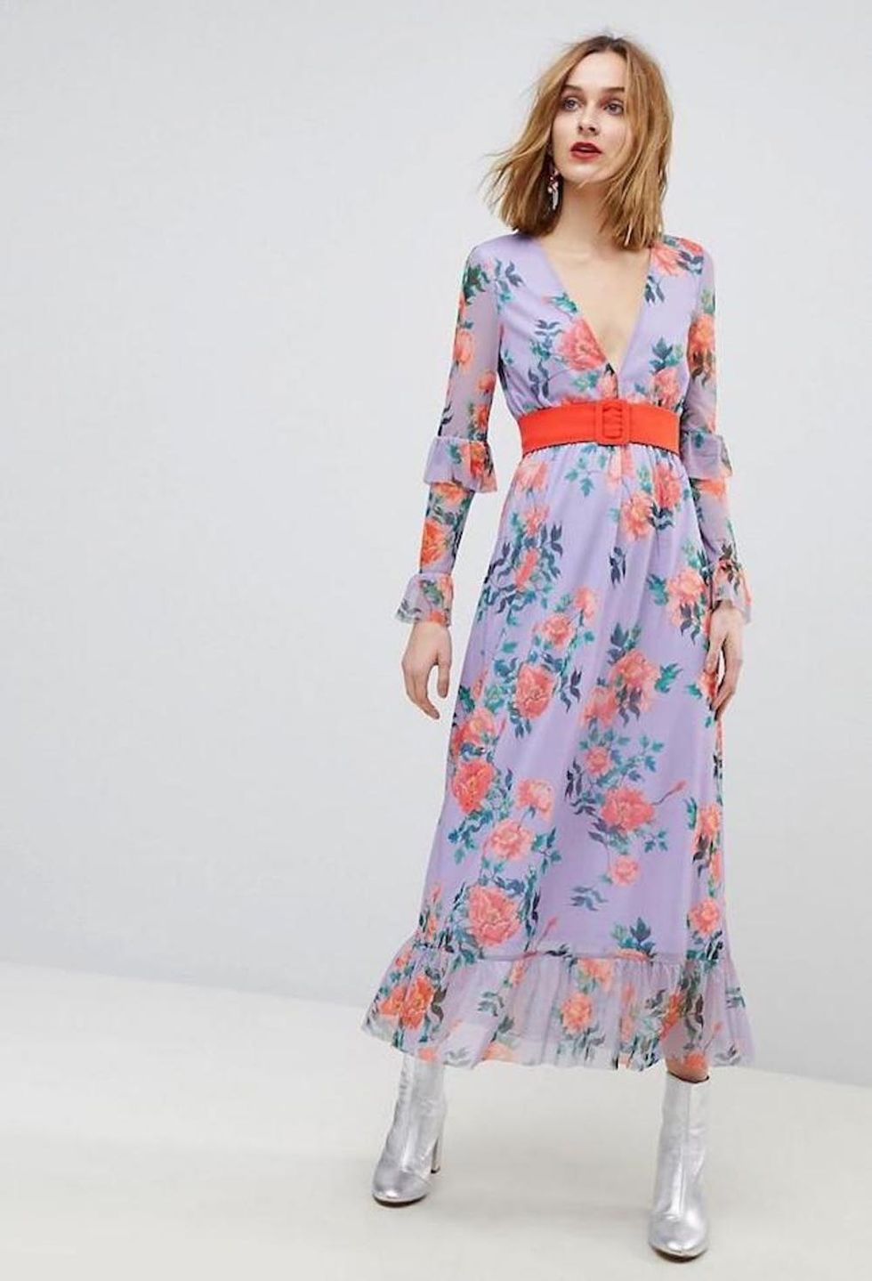 2. ASOS Printed Mesh Maxi Dress With Contrast Belt ($79): Pretty floral print and this season’s must-have hue? Now that’s a winning combination.