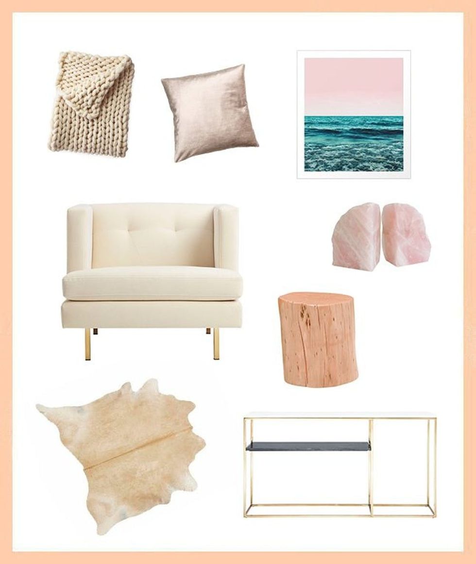 Serena & Lily Henley Wool Throw ($598), H&M Velvet Cushion Cover ($10), Society 6 Ocean Love by 83 Oranges ($22+), Alice Lane Rose Quartz Bookends ($69), Moe’s Home Stump Stool ($392+), CB2 Two Tone Marble Console Table ($599), Lulu & Georgia Malted Cowhide Rug ($568+), CB2 Avec Chair ($999)