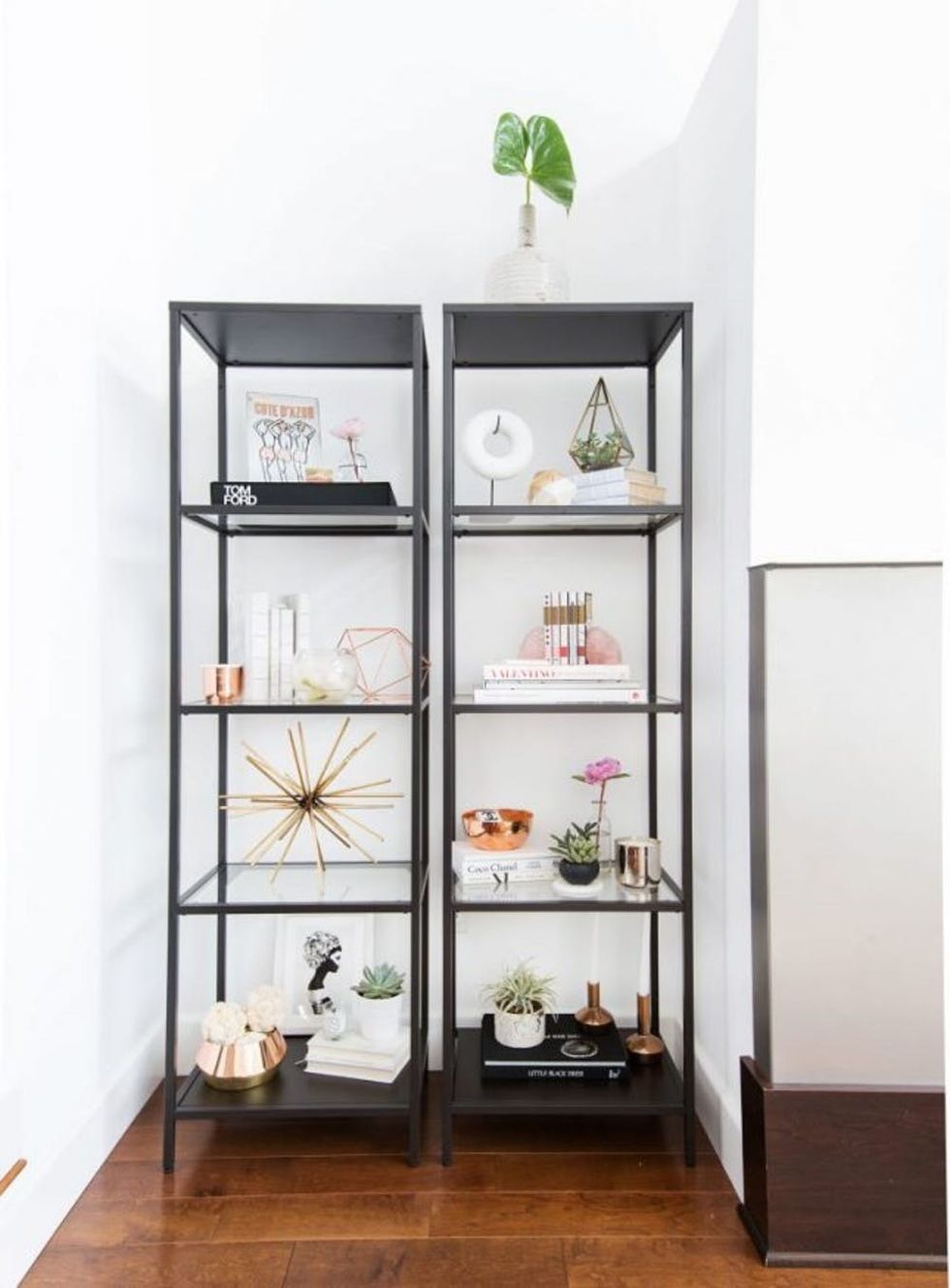 Whether you’re styling an entire bookshelf or just a wall-mounted shelf, it’s easy to steal the same look and give your space a touch of fashionista. Don’t be afraid to rock mixed metals with gold planters, copper candles, and silver accessories. Lastly, copy Hewitt’s chic mini indoor garden with a bunch of succulents, bud vases, and potted aloe mixed throughout your glam accents.