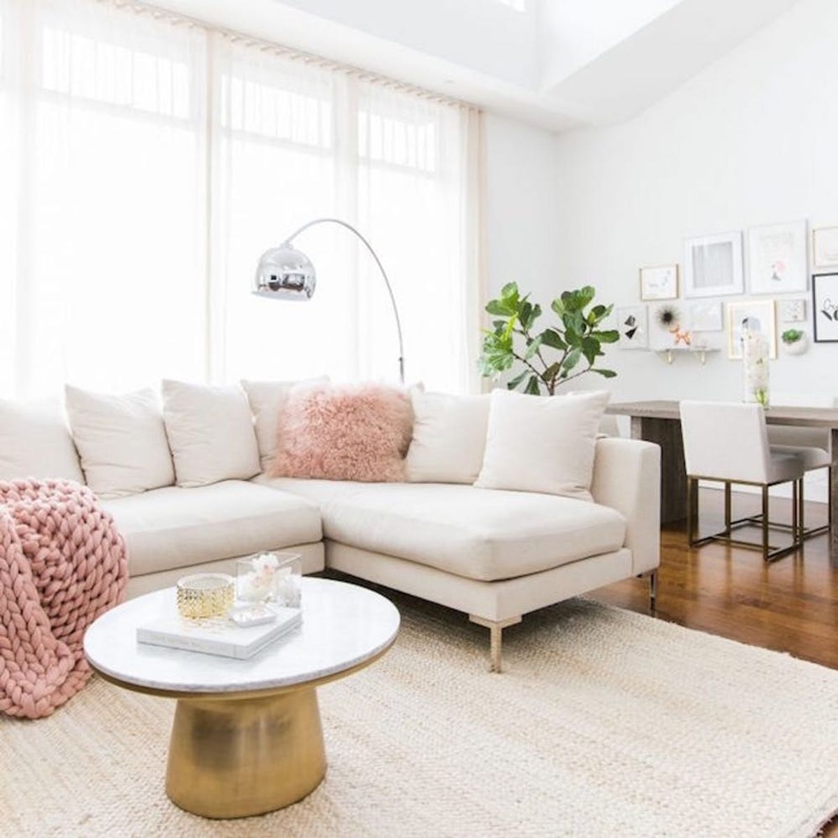 Pacific Coast Lighting Basque Floor Arc Lamp ($270), Garance Dore XO Print ($65), West Elm Mongolian Lamb Pillow Cover ($79+), H&M Moss-Knit Throw ($60), IKEA SÖDERHAMN Sectional ($899), Target Scented Jar Candle ($13), West Elm Marble Topped Pedestal Coffee Table ($699), Restoration Hardware Chunky Braided Jute Rug ($695+), Nearly Natural 32-Inch Fig Tree ($60)