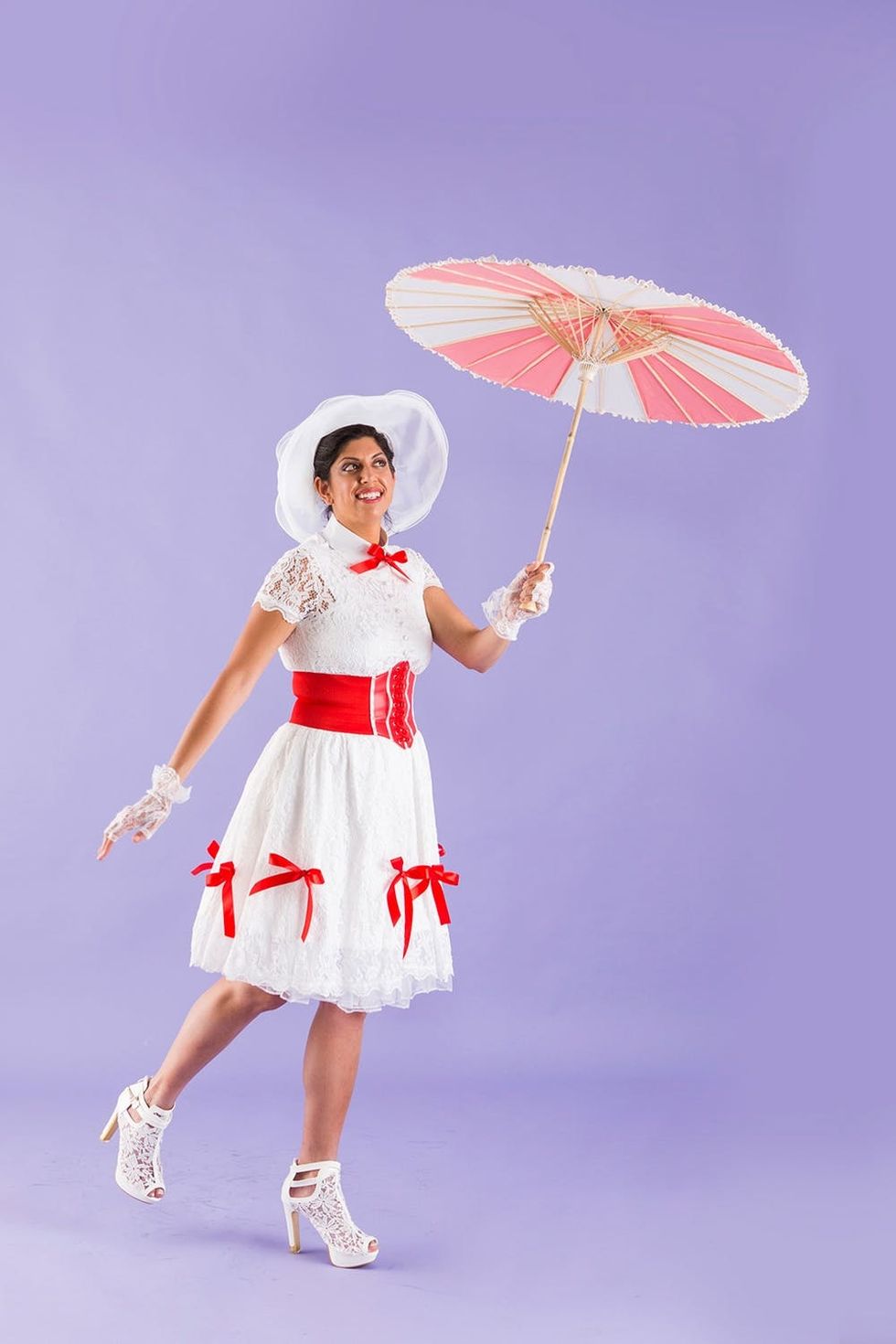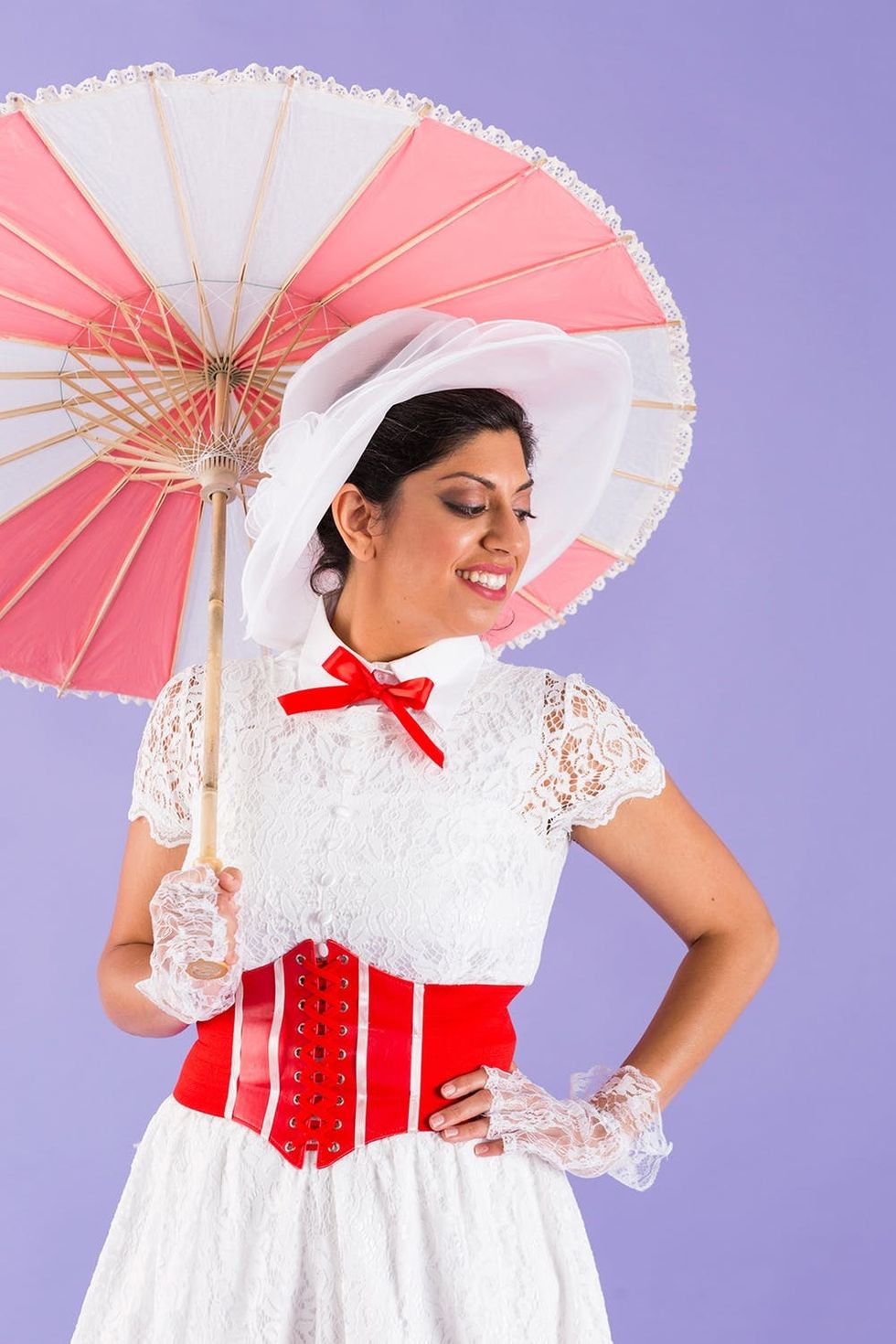 For the details, I bought a white MissCynthia Wide Brim Hat ($16) and a pair of white Fever Fingerless Lace Gloves ($7). For her shoes, any white bootie would do, but I bought a pair of Getmorebeauty Lace High Heel Ankle Boots ($38) from Amazon. I painted sections of a Cultural Intrigue White Paper Parasol ($12) pink and glued lace ribbon along the edge for Mary Poppin’s umbrella.