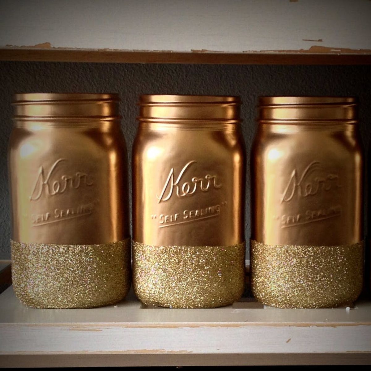 13. Gold and Glitter Dipped Mason Jars ($50 for set of 5): The glitz and glam of these mason jars set our phasers to stunned. This is a project you can buy or make yourself!