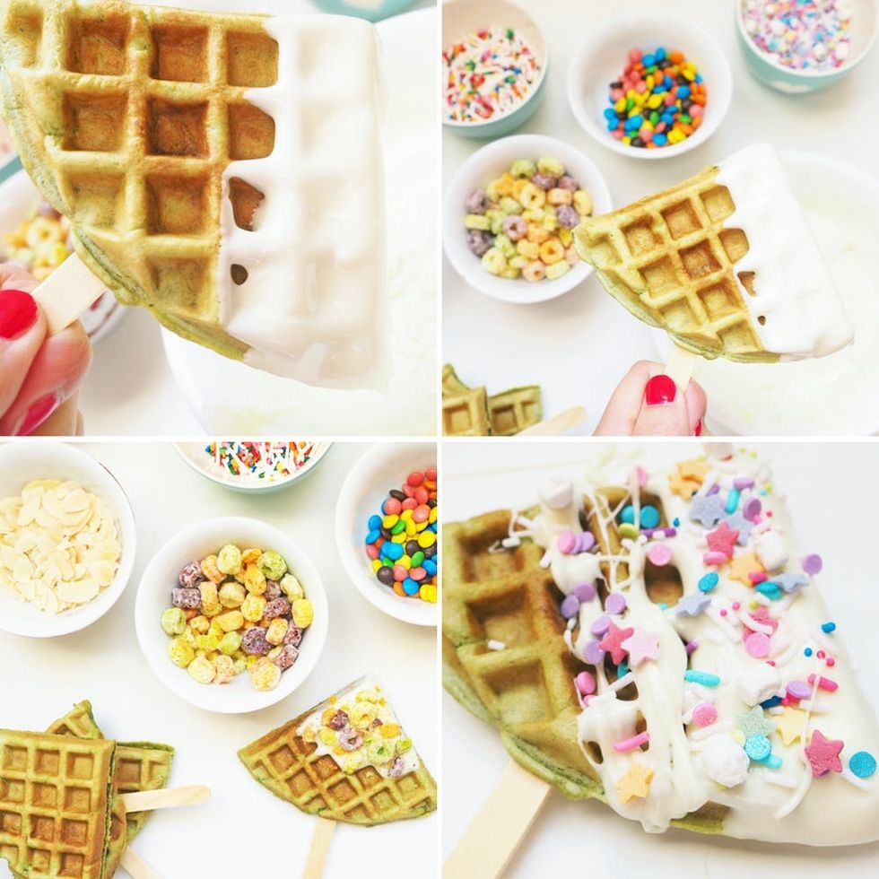 Prepare the ingredients for decorating. Melt chocolate on a double boiler, or in 30-second intervals in the microwave. Dip the waffles into the chocolate, as much or as little as you like. Before the chocolate sets, add on your toppings!
