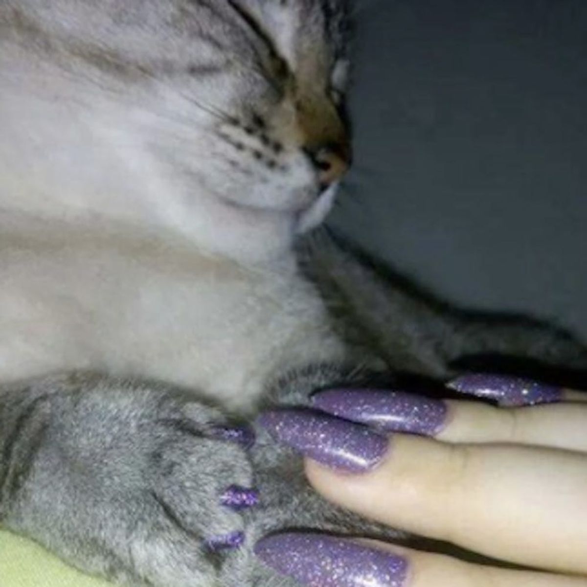 19-year-old Cristi Hanzel shared a snap of herself doing just that, with her sparkly purple nails perfectly matching her cat Wednesday’s claws. Before she knew it, the image had gone viral, as loving pet owners around the country admired the shot for its sheer adorableness.