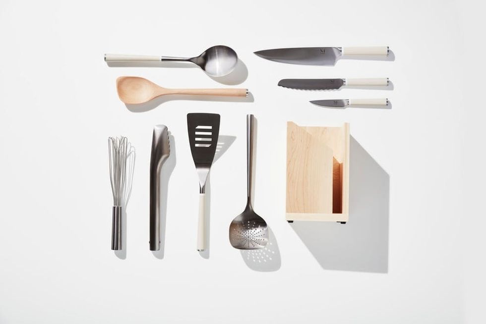 Each piece has sleek, modern angles and comes with either light, dark, blush, or blue-gray handles. Most importantly, everything works ridiculously well. The knives are paper-cutting sharp, the spatula can flip anything from flaky fish to sturdy pancakes, and the spoons go seamlessly from stirring to serving.