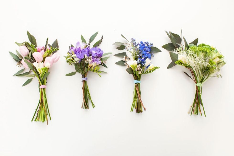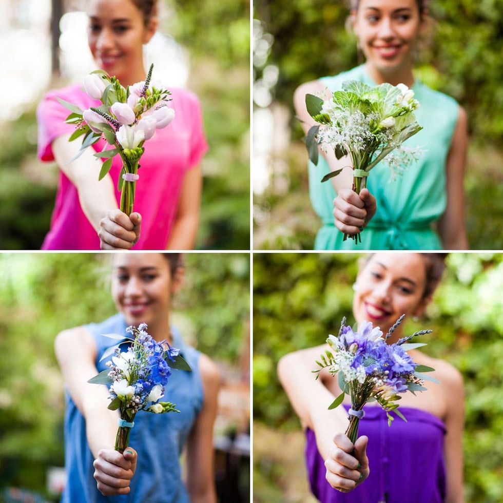 April showers bring May flowers, as the saying goes. Thankfully, May is finally here and flowers everywhere are in full bloom. There are loads of exquisite blossoms to choose from and the smell is to die for. Today we’re making four colorful arrangements wrapped with color-corresponding VELCRO® Brand One-Wrap Straps. These color-coordinated bouquets would be great for bridesmaids, for a Mother’s Day brunch or just for adding some natural color into your home.