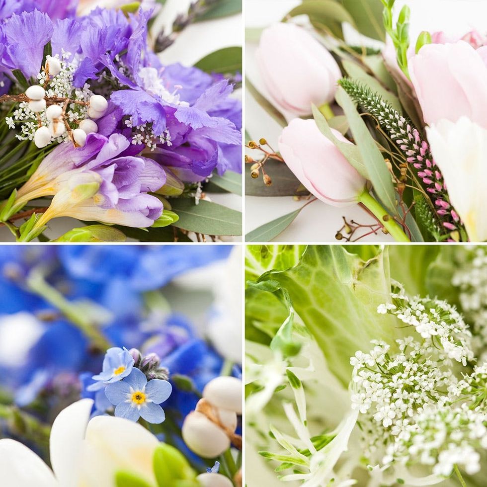 We’re making four arrangements today. We’ve got some delicate pink flowers, some gorgeous purple blooms, some natural blue buds and some green goodies.