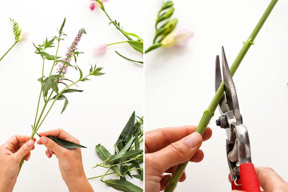 2. Cut and process the flowers by trimming the stems at an angle and pulling off the leaves.
