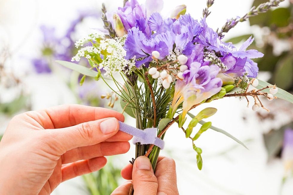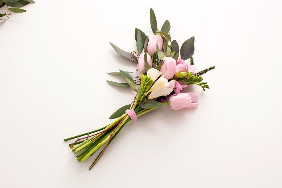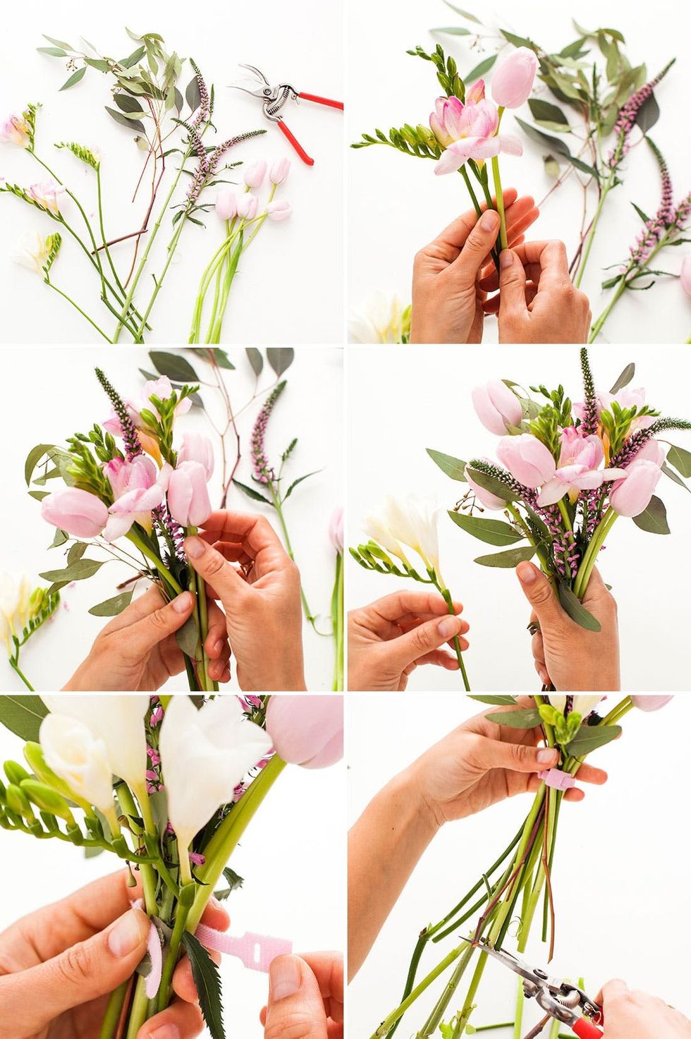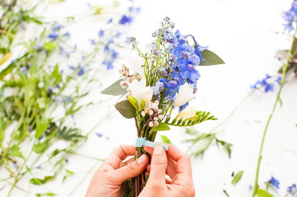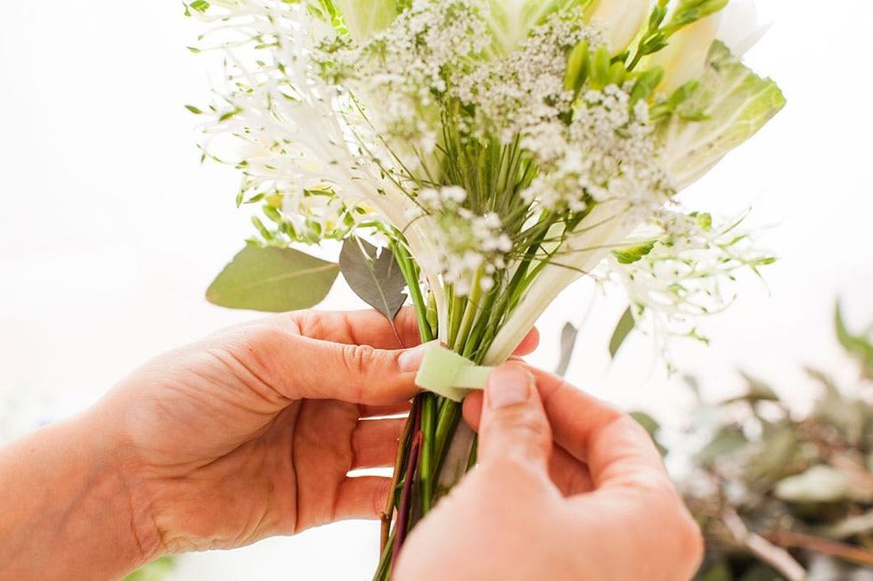 Now for the fun part — arrangement time. Carefully select the flowers you want to use in your bouquet. Create the bouquet in one hand so that you can see what the flowers will look like together. It’s best to bunch a few of the same type of flower in your arrangement so that the bouquet doesn’t look spotted, so if you are using roses, put two or three of them right next to each other. Once your bouquet is finished, take a VELCRO® Brand ONE-WRAP® Strap and bind it tightly around the stems. If your flowers are heavy, you can add a second strap for more stability. Make sure to put the strap close to the base of the flowers so they won’t splay. Trim the stems the same length and that’s it!