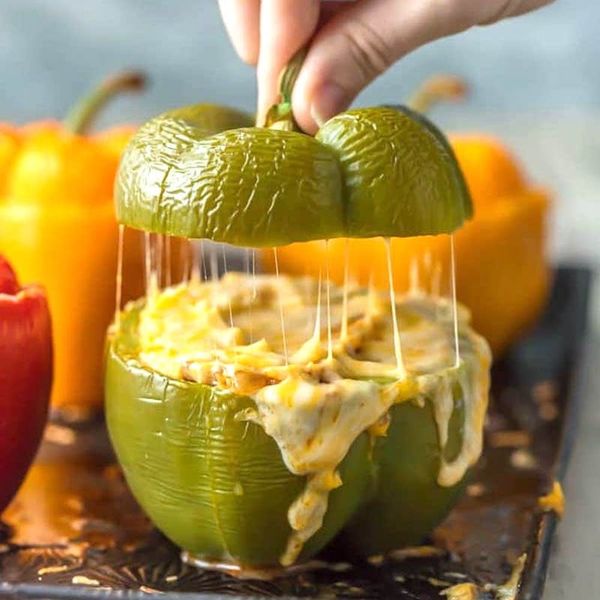 Chicken, rice, corn, and black beans fill these peppers to the brim. Top with a sprinkle of Monterey Jack, and these could basically replace taco Tuesday. (via Cooking Classy)