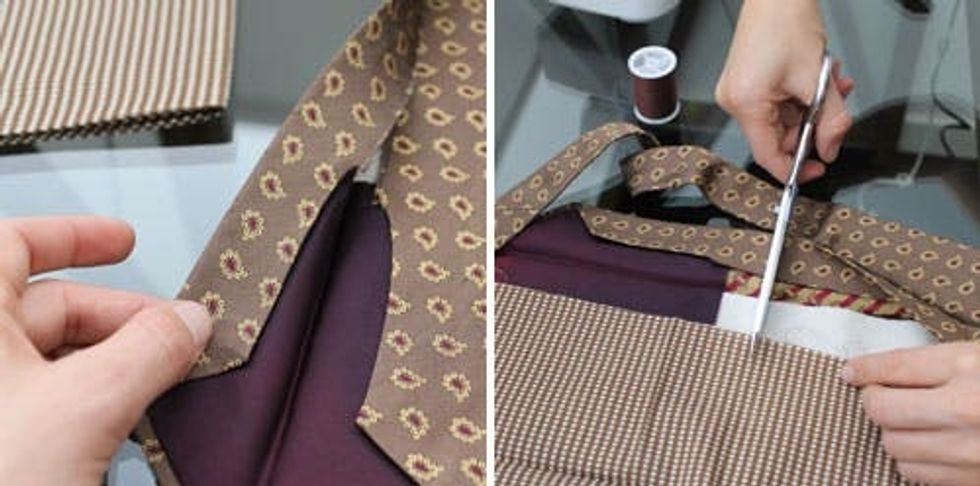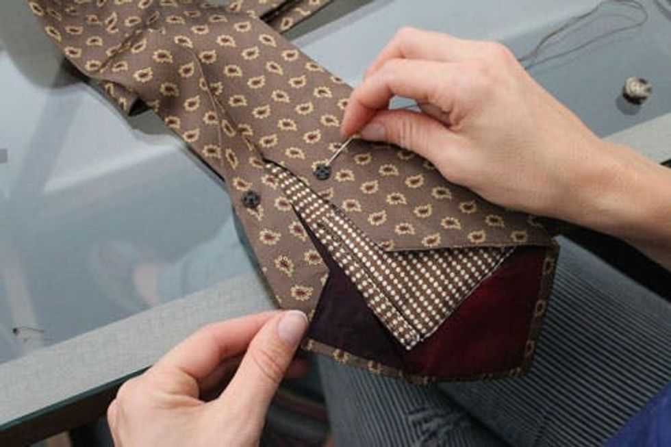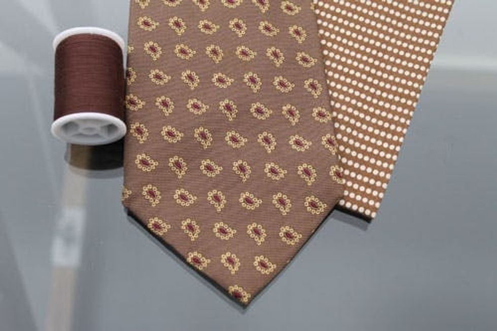 First, get your materials in order. An old tie, a piece of fabric that matches, and thread.