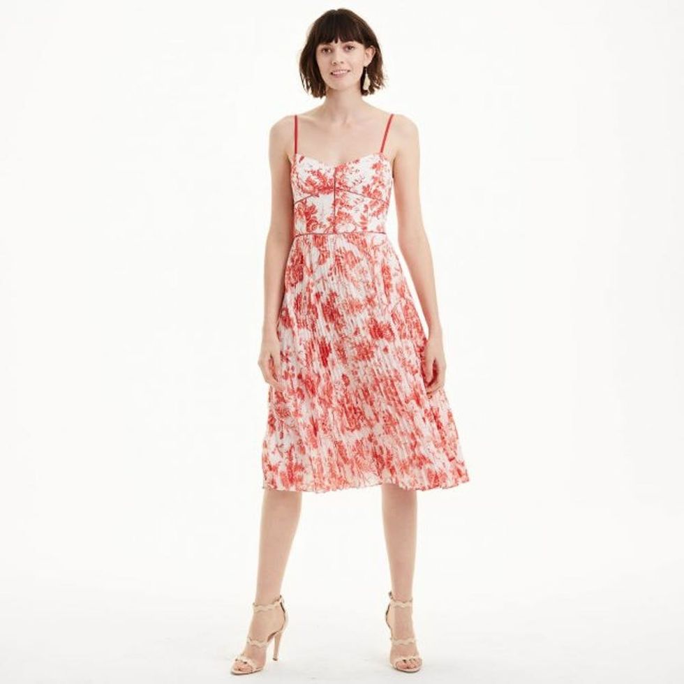 Markle, 35, opted for the red and white Club Monaco Sinthea slip dress ($329) with red Stuart Weitzman Nudist heels. Her hair was parted down the center, tousled in loose waves.
