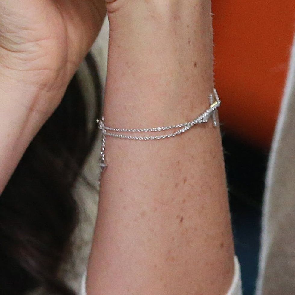 While visiting Birmingham, England, last Thursday, the Suits star debuted a delicate silver bracelet featuring a tiny cross.