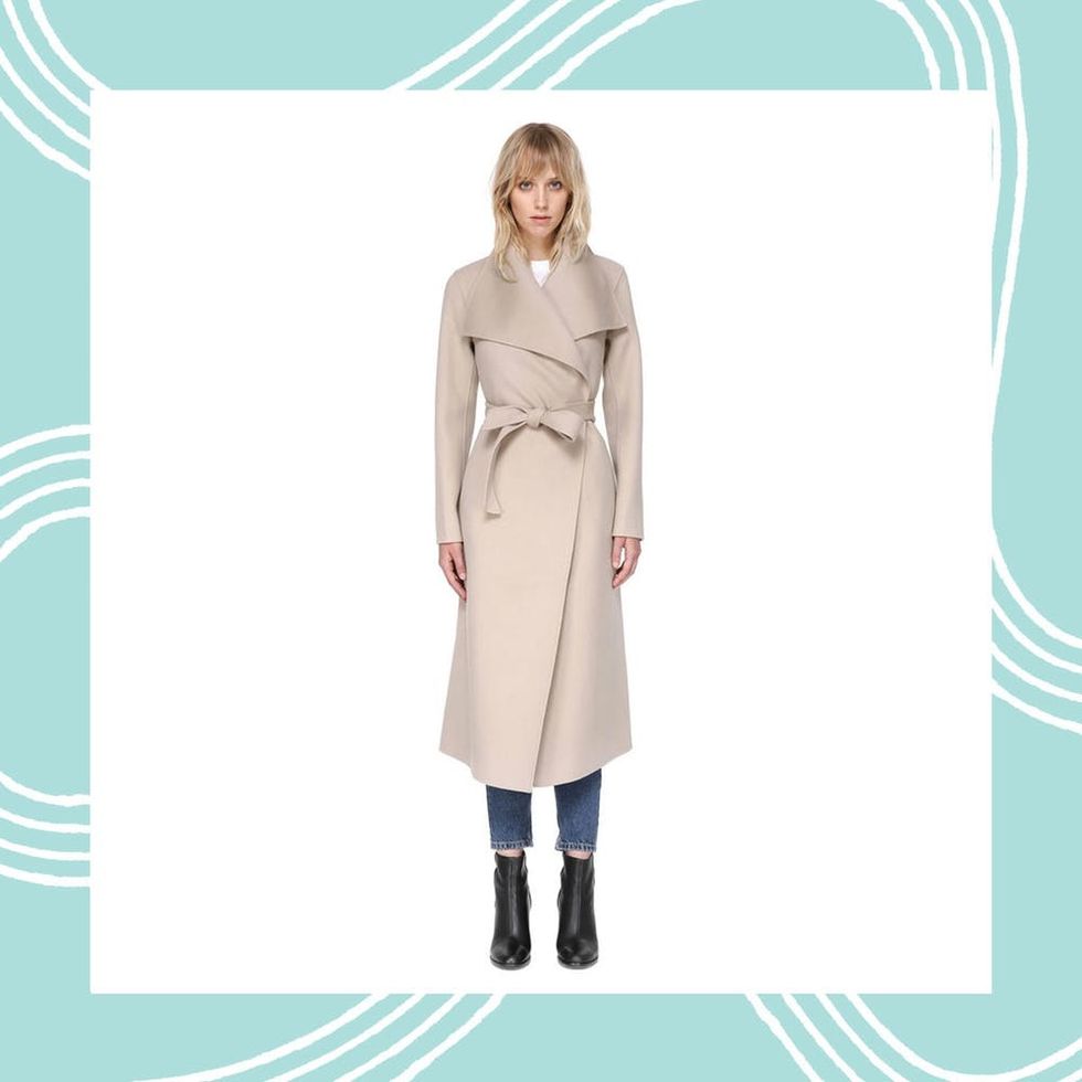 With its tie-belt waist and asymmetrical wrap silhouette (complete with widespread collar), it’s a piece that looks plenty cozy when pulled tight against brutal winds.