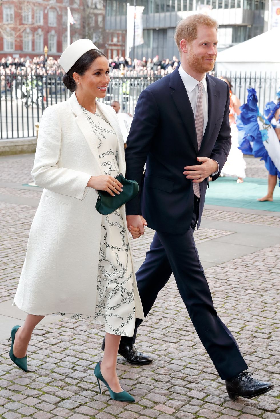 The Duchess of Sussex attends the 2019 Commonwealth Day service at Westminster Abbey on March 11, 2019, in London, England donning hints of green in her custom Victoria Beckham cream coat and dress. Markle accessorized her look with a Victoria Beckham pillbox hat, coordinating heels and clutch. (Photo via Max Mumby/Indigo/Getty)
