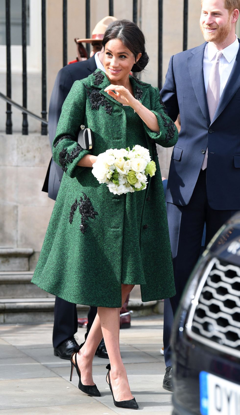 Markle visits a Commonwealth Day Youth Event at Canada House on March 11, 2019, in London, England wearing a green bespoke look by Erdem, Deneuve heels by Aquazurra and a Givenchy clutch. (Photo via Karwai Tang/WireImage)