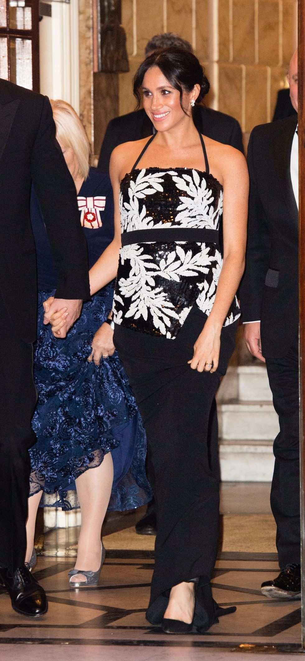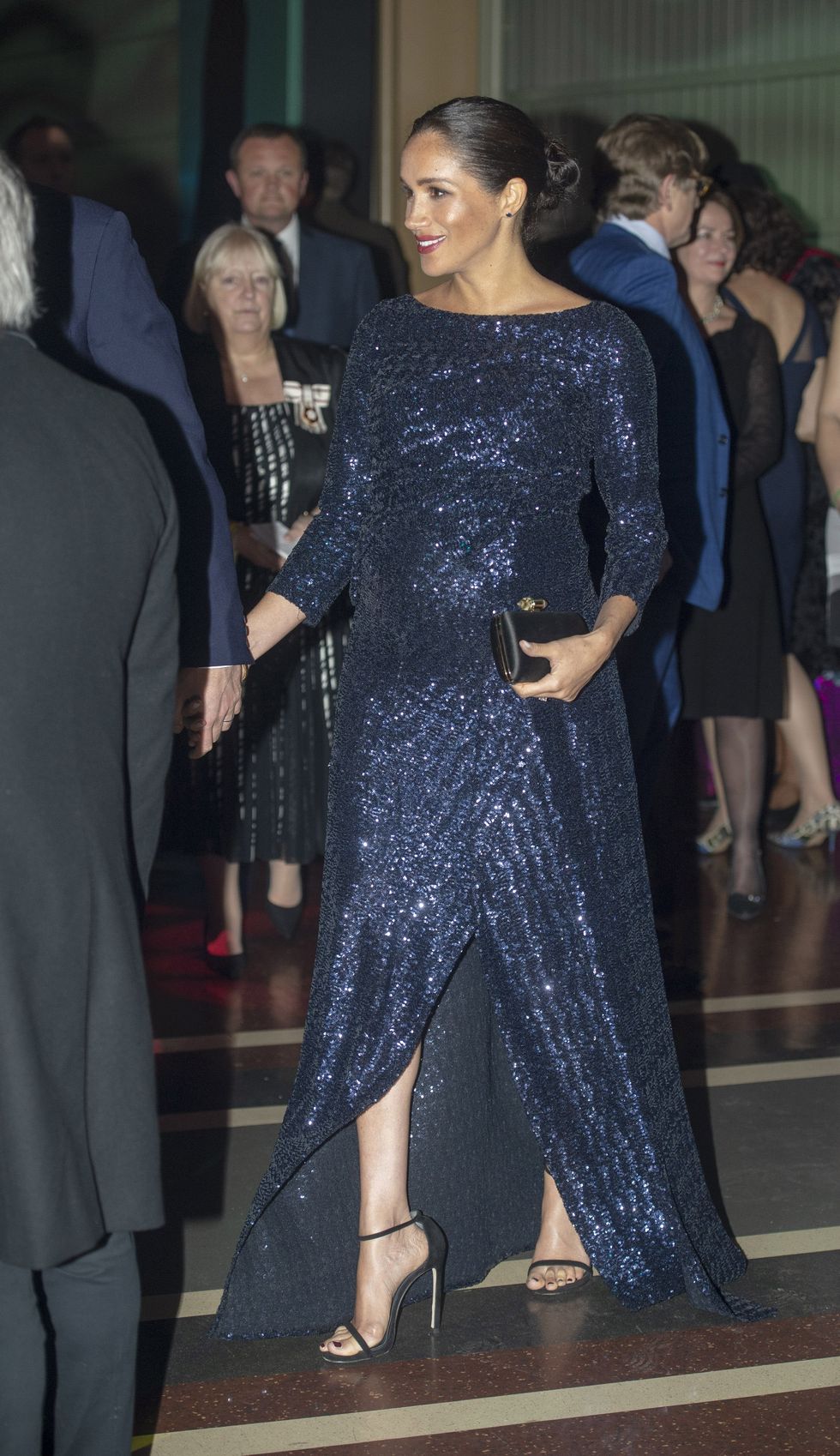 Markle enjoys the Cirque du Soleil premiere of TOTEM at Royal Albert Hall on January 16, 2019 in London, England in a sequin Roland Mouret gown, black strappy heels, and a Givenchy clutch. (Photo via Paul Grover - WPA Pool/Getty)