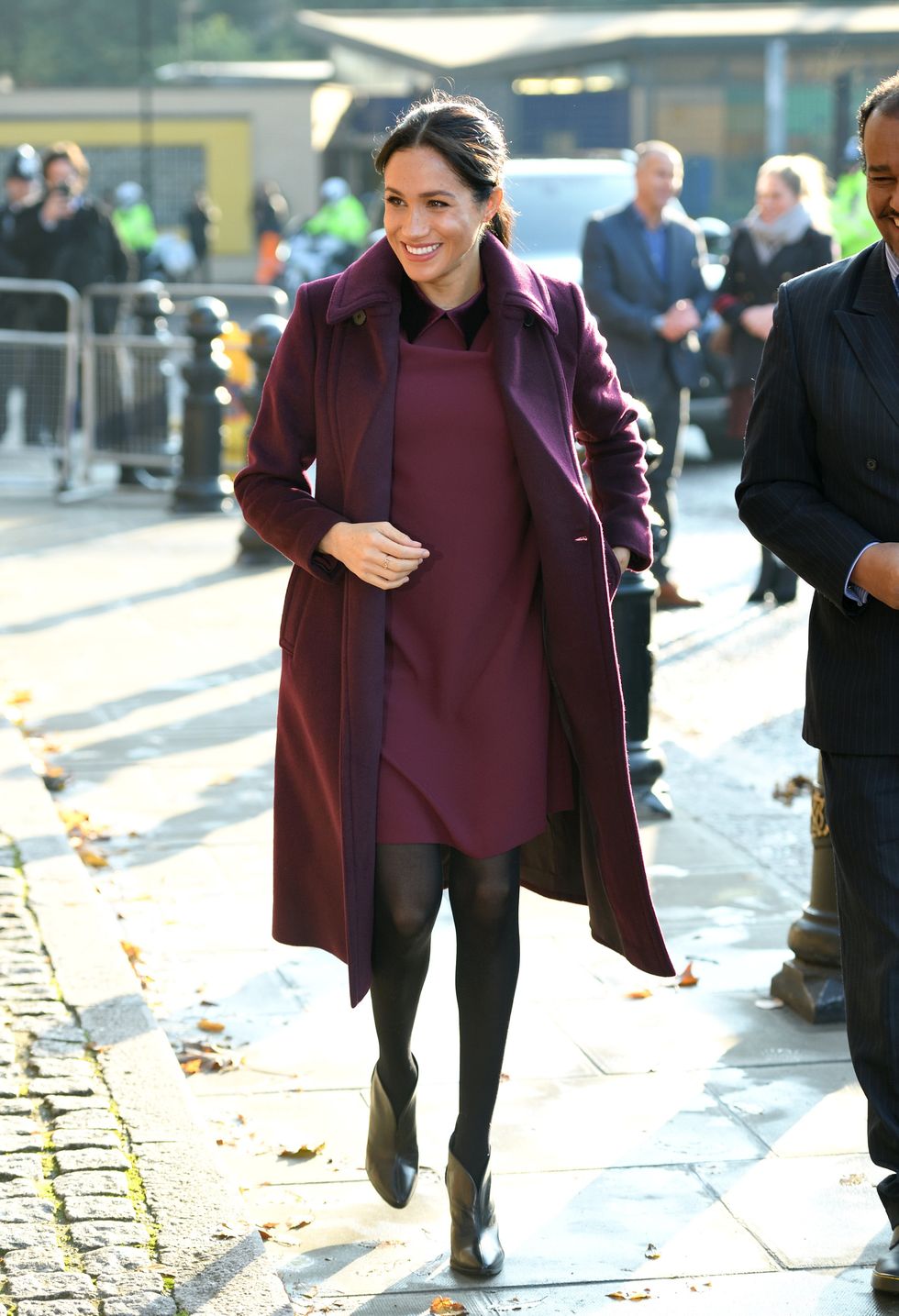 The Duchess of Sussex visits Smart Works on January 10, 2019, in London, England wearing an Oscar de la Renta coat, Hatch maternity dress, printed shoes, and Victoria Beckham structured bag. (Photo via Neil Mockford/GC Images)