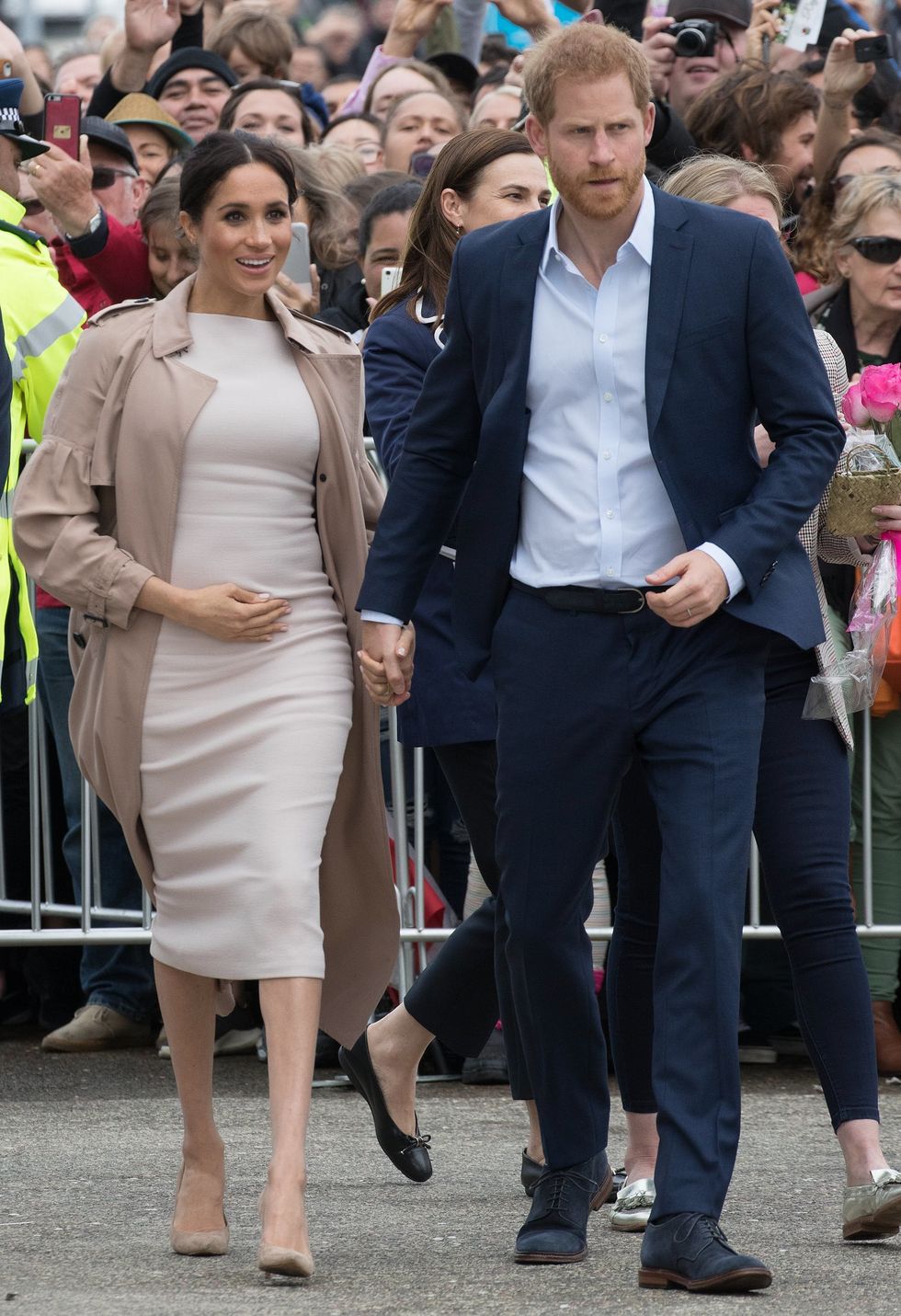 Markle meets the public in Viaduct Harbour on October 30, 2018, in Auckland, New Zealand, wearing a custom Brandon Maxwell dress, Stuart Weitzman pumps, and a nude trench coat. (Photo via Pool/Samir Hussein/WireImage)