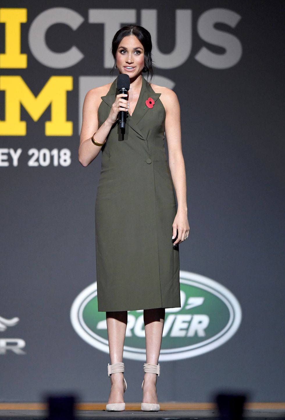 The Duchess of Sussex speaks during the Invictus Games Closing Ceremony at Qudos Bank Arena on October 27, 2018, in Sydney, Australia wearing an olive Antonio Berardi tux dress and Aquazzura heels. (Photo via Karwai Tang/WireImage)