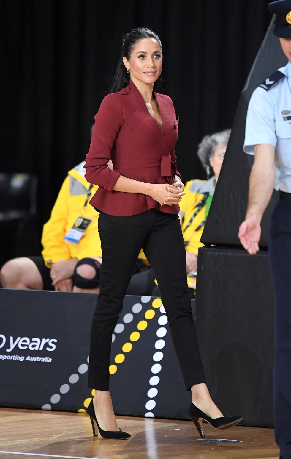 Markle struts at the wheelchair basketball final during the Invictus Games at the Quay Centre on October 27, 2018, in Sydney, Australia wearing a maroon top by Australian label Scanlan Theodore paired with black Outland jeans and Sarah Flint heels. (Photo via Karwai Tang/WireImage)
