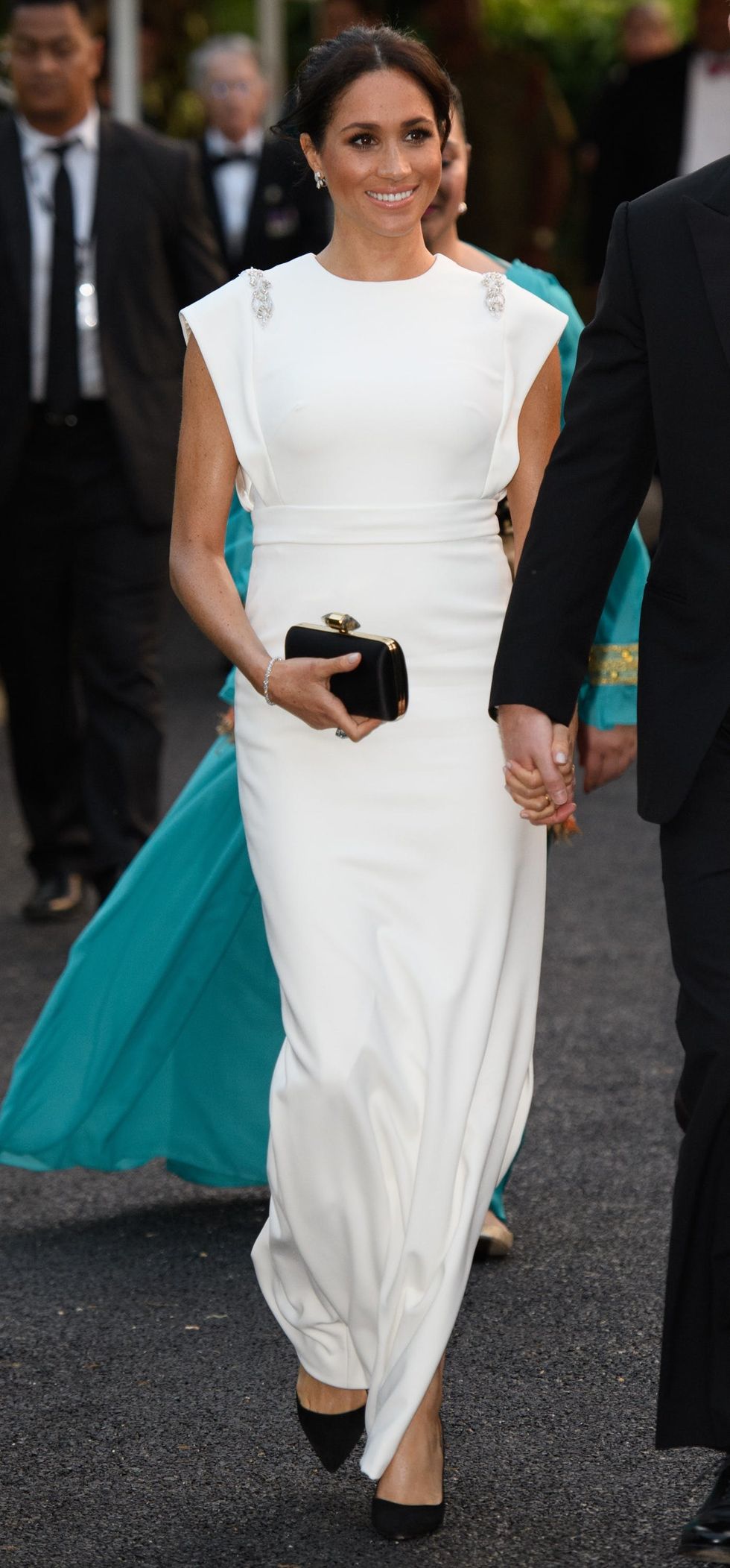 The Duchess of Sussex goes to the Consular House in NukuÕalofa on October 25, 2018, in Nuku'alofa, Tonga looking regal in a white Theia gown, Aquazzura Deneuve heels, and a Givenchy clutch. (Photo via Pool/Samir Hussein/WireImage)
