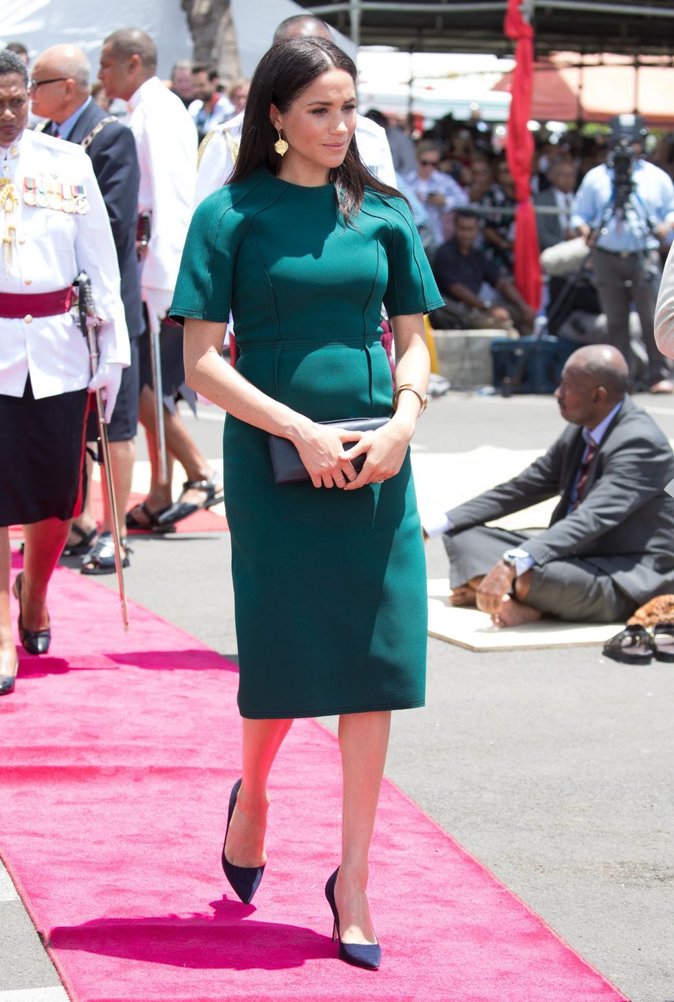 Markle attends the unveiling of the Labalaba Statue on October 25, 2018, in Nadi, Fiji wearing a green shift by Jason Wu and black Manolo Blahnik BB pumps. (Photo via Pool/Samir Hussein/WireImage)
