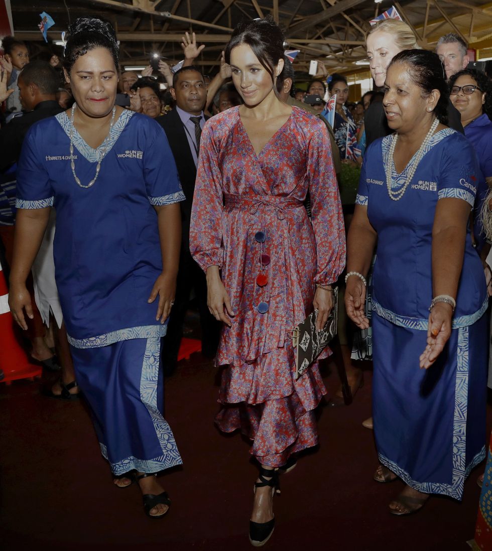 The Duchess of Sussex stops by a market on October 24, 2018, in Suva, Fiji wearing the Federica dress by Figue and black espadrilles. (Photo via Kirsty Wigglesworth - Pool/Getty)